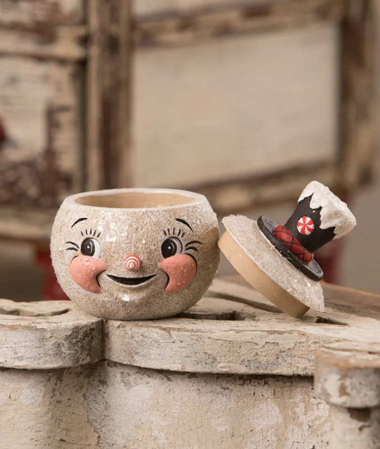 It’s time for some peppermint magic with this happy snowman head by Johanna Parker. Candy Stripe Pete comes with a lid, so fill it with treats or a little Christmas gift! A layer of mica adds sparkle and shine!