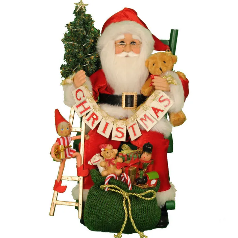 Karen Didion Original 17 inch Lighted Christmas Eve Santa is great for any shelf, mantle and countertop. The quality is unmatched with this decorative piece’s hand-painted face, mohair beard, unique fabric, and detailed accessories. With his fun details, beautiful lit tree, and traditional style rocker; he’s great as a gift or as a collectible item for your own family and he’s sure to add character and style to any home.Lights are battery operated. Requires two CR2032 batteries.